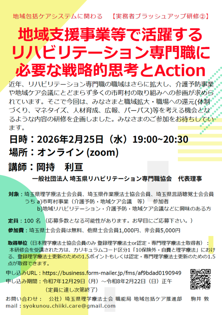 和7年度地域包括ケアシステムに関わるリハ専門職 実務者ブラッシュアップ研修②のご案内です。