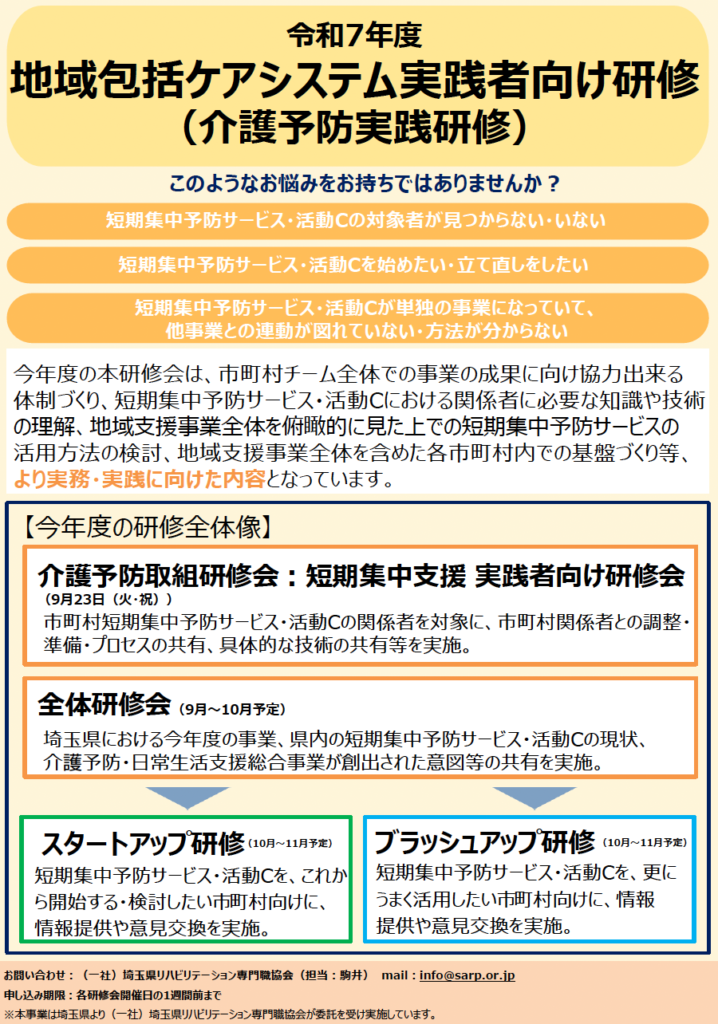 本研修会は令和7年度地域包括ケアシステム実践者向け研修(介護予防実践研修)の一環として実施いたします。別添チラシに記載の全体研修会、スタートアップ研修会及びブラッシュアップ研修会につきましては、後日別途通知させていただきます。